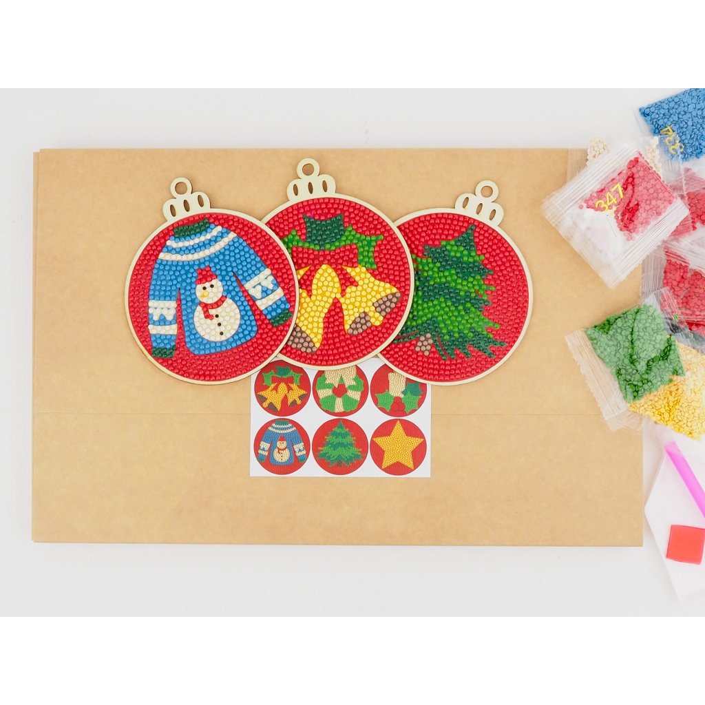 Autocollants de peinture diamant de Noël en édition spéciale, accompagnés de plaques en bois découpées avec précision, sur lesquelles vous pouvez coller les autocollants des deux côtés, et de ficelles qui vous permettent de les accrocher au sapin de Noël. Décorez votre sapin de manière créative cette année !