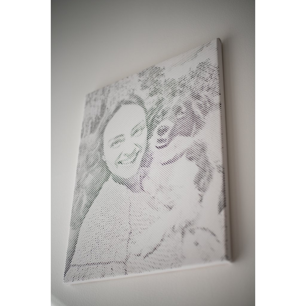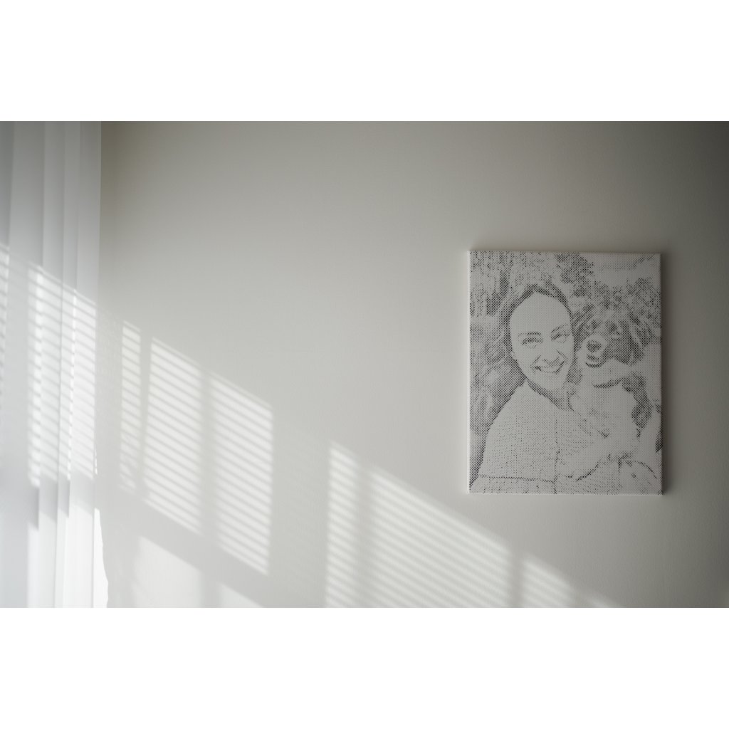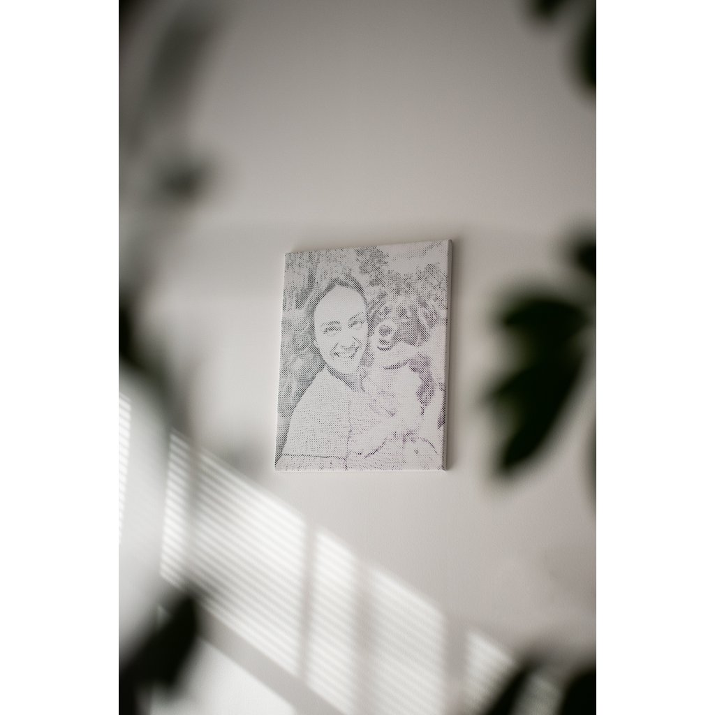 Dès que le dernier point aura été posé, vous pourrez admirer votre magnifique œuvre d'art bicolore, transformée à partir d'une photo, sur votre mur (valable pour la version avec cadre intérieur).
