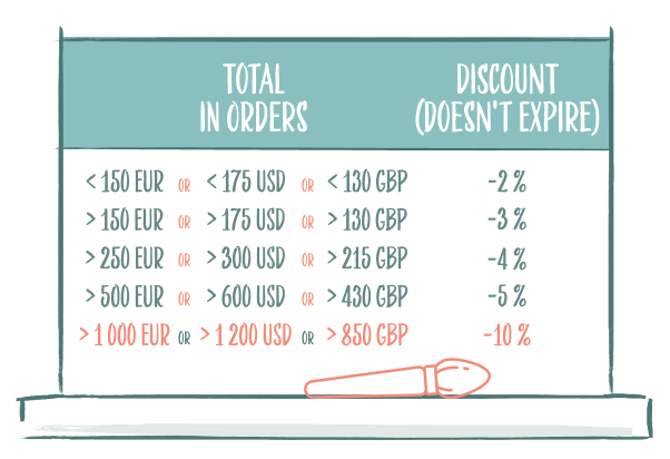 Si vous êtes déjà inscrit, vous faites automatiquement partie de notre programme de fidélité ! Les remises sont automatiquement déduites avant l’achat et visibles dans le panier, conformément au tableau des remises ci-dessous :